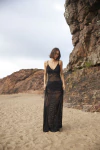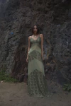 • Este vestido tipo corset, confeccionado en géneros de alta costura, destaca por su silueta sirena al cuerpo, con un corte en la cintura que estiliza la figura.